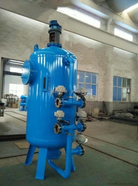 該型過濾器過濾時濾液高進(jìn)低出,反洗時反洗 水低進(jìn)高出,反洗水不間斷,清水消耗量大;攪拌 槳葉采用標(biāo)準(zhǔn)直葉片或斜葉片,對濾料傷害大,槳 葉一般不反轉(zhuǎn),使纖維球和水流同向旋轉(zhuǎn)運動,導(dǎo)致反洗水對濾料沖洗力不大,濾料不易洗凈。